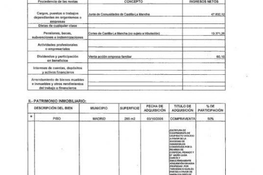 Además, Cospedal declaró en 2012 tener la propiedad del 50% de un piso de 265 metros cuadrados en Madrid, la tercera parte de un local en Albacete de 133 metros cuadrados y el 50% de una casa en Toledo procedente de una donación, de un total de 180 metros cuadrados.