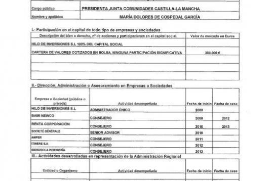 Por otro lado, Ignacio López del Hierro, como cónyuge de la presidenta, ha presentado una declaración de bienes correspondiente al año 2012 en la que refleja una cartera de valores en bolsa de 300.000 euros.