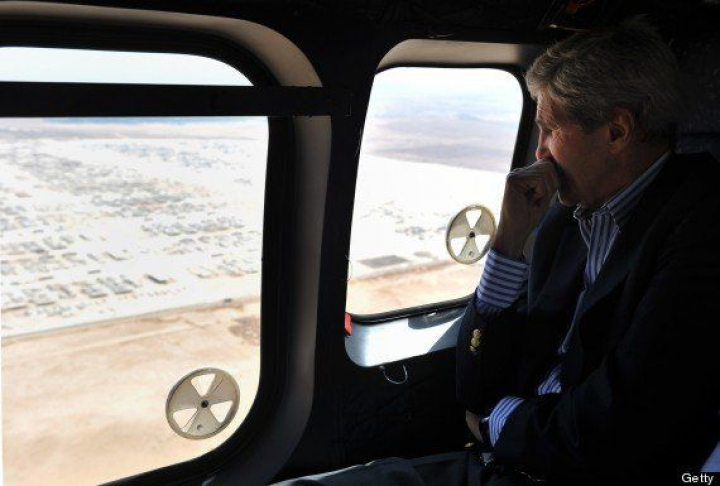 El secretario de Estado de los Estados Unidos, John Kerry, observa desde el helicóptero el campo de refugiados de Zaatari en julio de 18 de 2013 cerca de la ciudad jordana de Mafraq, a 8 kilómetros de la frontera. (MANDEL NGAN/AFP/Getty Images)