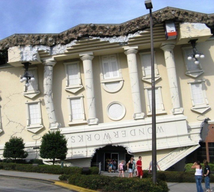 Y de la Casa Torcida a la casa del revés. La idea era crear algo que pareciera haber caído del cielo, ¡y lo consiguieron! Dentro hay una especie de museo con exhibiciones interactivas, simuladores de huracanes, terremotos, juegos con pistolas láser, etc.