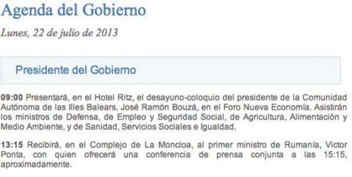 De momento, en su primera oportunidad para aclararlo durante este lunes, Rajoy la ha despachado sin referirse al caso Bárcenas y, tras media hora en el Ritz, ha abandonado el lugar sin hacer declaraciones a los periodistas. Según Moncloa, para llegar a la recepción con el presidente rumano, que es a las 13:15 horas.