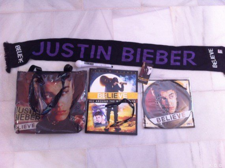 Merchandising de Bieber entregado en el concierto de Madrid el pasado marzo: bufanda, bolsa, póster, vinilo, micrófono y entrada VIP