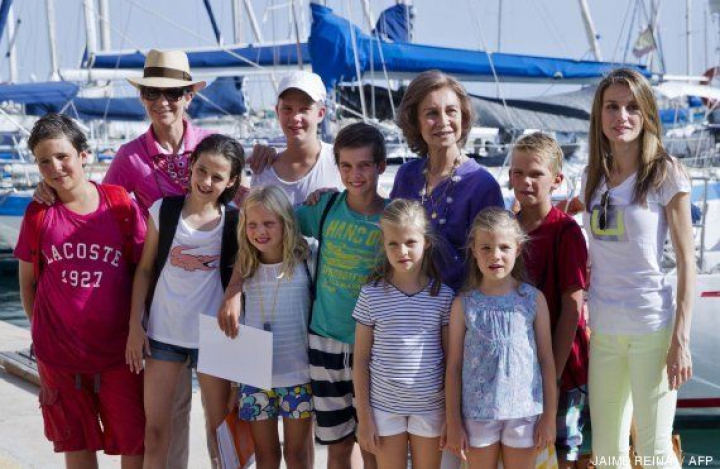 La Reina Sofía (3 por la derecha) con Letizia (dcha.), la infanta Elena ( segunda izda.) y, de izquierda a derecha, los nietos de los Reyes, Felipe Juan Froilán y Victoria Federica (hijos de Elena y Jaime de Marichalar); Irene, Juan Valentin (detrás), Pablo Nicolás y después Miguel (hijos de la infanta Cristina e Iñaki Urdangarin) y las infantas Leonor y Sofia, hijas de los Príncipes de Asturias