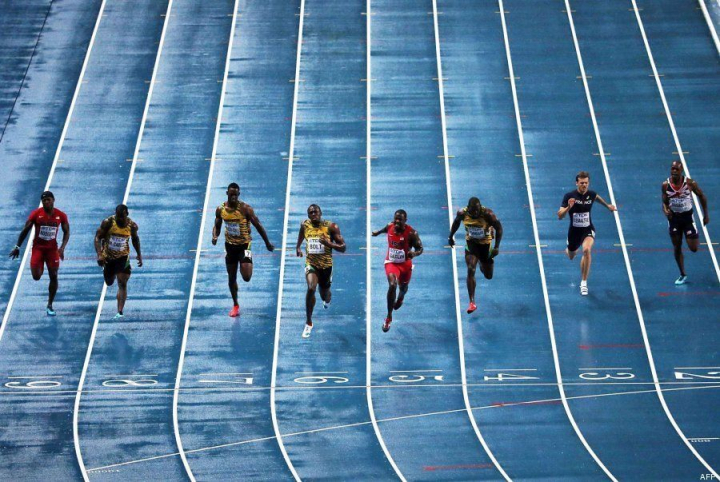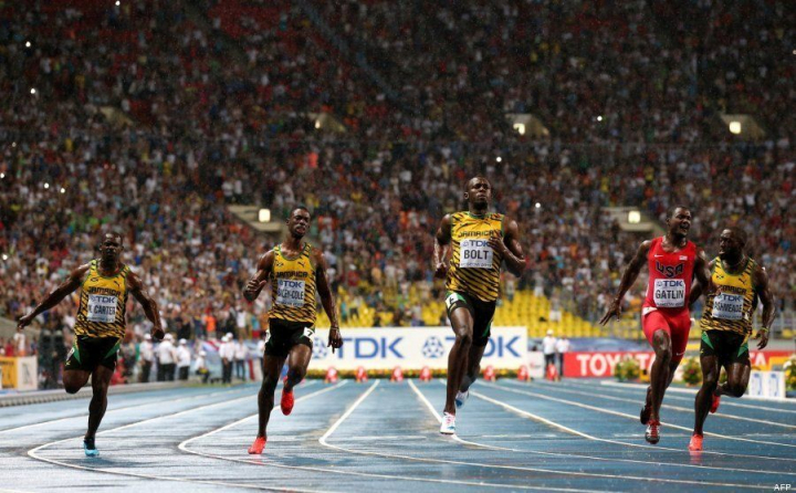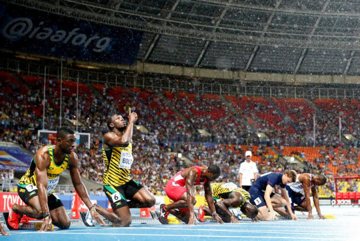 "No fue cantando bajo la lluvia, fue corriendo bajo la lluvia". Así ha resumido Usain Bolt la final de los 100 metros lisos del Mundial de Atletismo de Moscú, que le valió al jamaicano otro título mundial más.