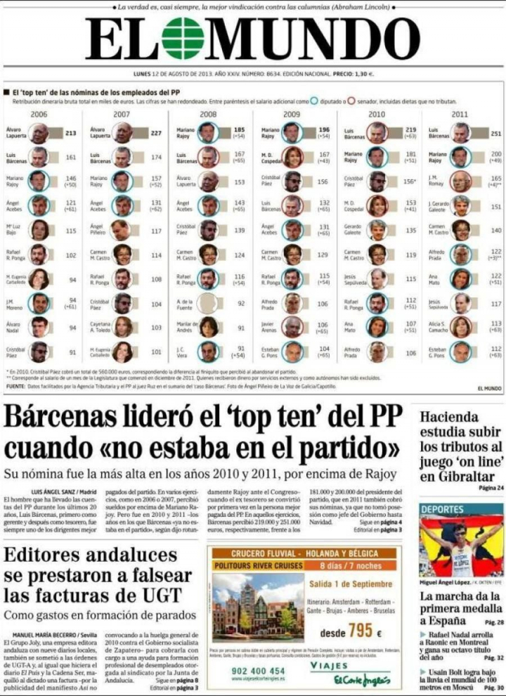 Bárcenas cobró más que Rajoy durante años y en 2010 y 2011, justo en los años en los que Rajoy ha afirmado que Bárcenas "ya no estaba en el partido", el ex tesorero cobró como nadie en el PP: 219.000 y 251.000 euros, respectivamente. Según explica El Mundo, que lleva a portada el top ten de los políticos que más cobraban en el PP en los últimos años, Mariano Rajoy cobró en esos dos ejercicios 181.000 y 200.000 euros.