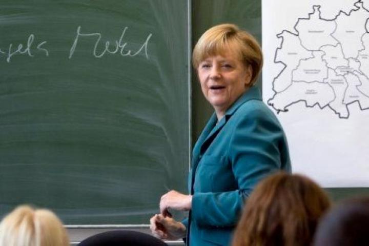 Para presentar el acto, Merkel escribió su nombre en la pizarra, y después dialogó con los alumnos que quisieron preguntarle alguna cuestión. Durante la intervención, la canciller relató algún episodio de su infancia en territorio de la República Democrática Alemana (RDA).