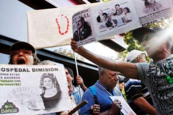 En un lado, un grupo de unos 10 afectados por las preferentes de Bankia, la mayoría gente mayor con pancartas que claman contra la corrupción en el Gobierno y piden justicia.