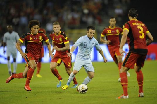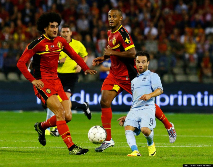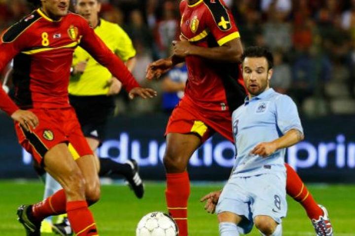 Esta imagen del futbolista francés Mathieu Valbuena, captada por un fotógrafo de la agencia Reuters, muestra al jugador galo mucho más pequeño que los rivales de la selección de Bélgica.