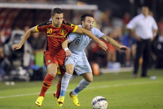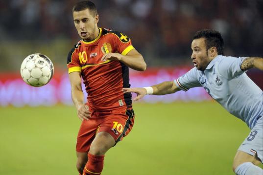 Belgium's midfielder Eden Hazard (L) and France's forward Mathieu Valbuena vie for the ball during the 2014 World Cup friendly football match between Belgium and France at the King Baudouin stadium in Brussels on August 14, 2013. AFP PHOTO / JOH...
