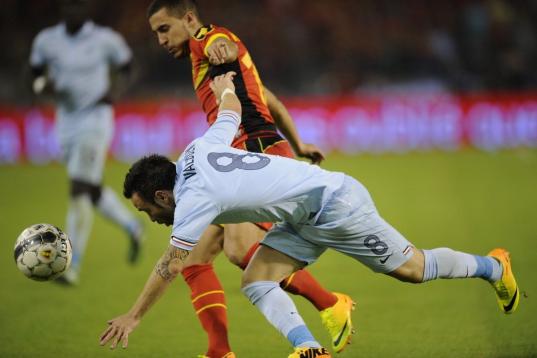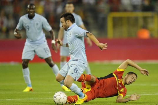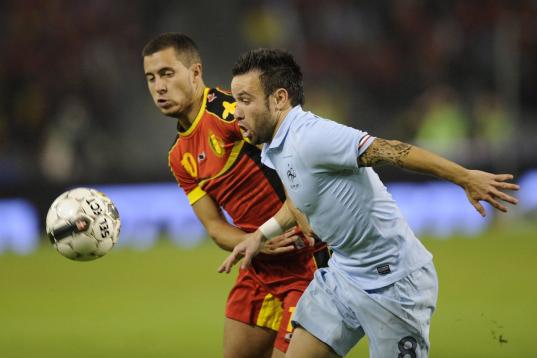 Belgium's midfielder Eden Hazard (L) vies with France's forward Mathieu Valbuena (R) during a friendly football match between Belgium and France at King Baudouin stadium in Brussels on August 14, 2013. AFP PHOTO / JOHN THYS (Photo credit ...