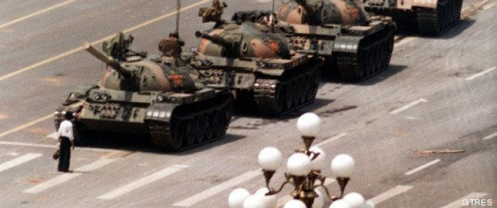 La imagen es icónica y recuerda a la del hombre ante el tanque de Tiananmen, en China.
