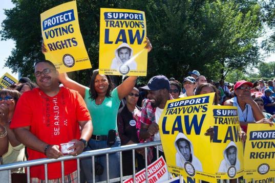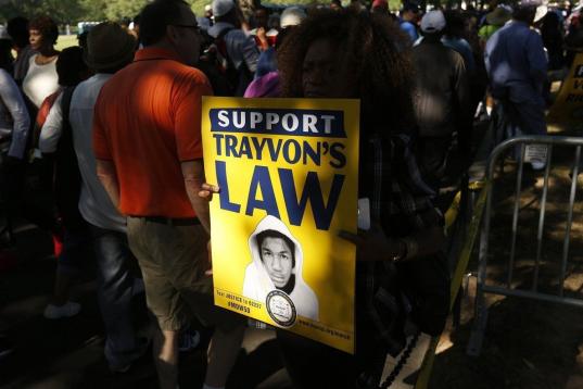 Muchos de los asistentes portaban carteles con la cara del joven Trayvon Martin, un adolescente negro de 17 años que fue asesinado el año pasado en Florida por un vigilante voluntario, George Zimmerman, quien recientemente fue encontrado no culpable de la muerte del joven.