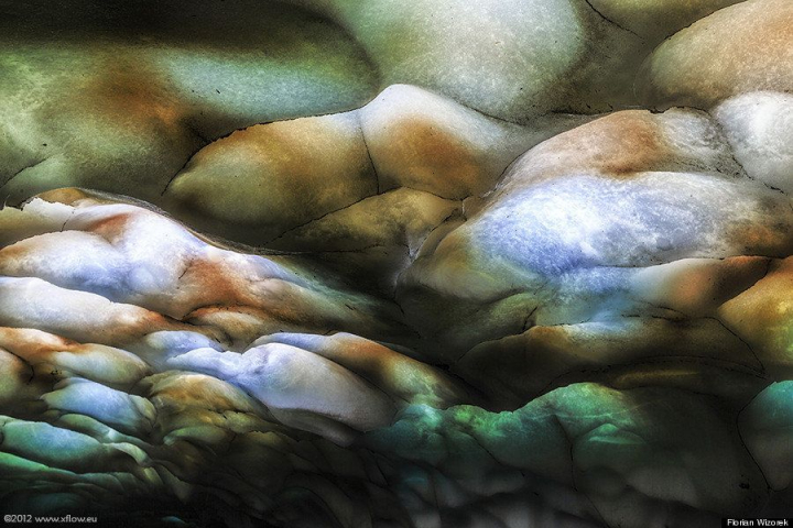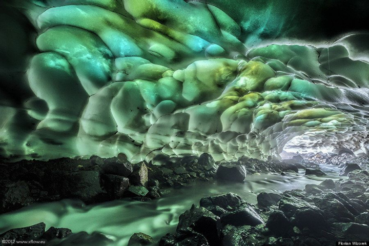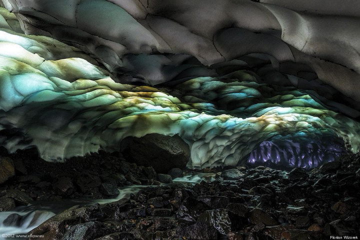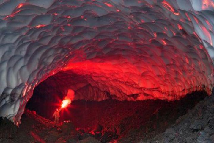 La cueva fue formada por un arroyo que discurría por los glaciares en la parte baja del volcán. Como cuenta Budko, se trata de un lugar generalmente inaccesible, pero las nevadas escasas y un verano especialmente caluroso han dejado en las cuevas un techo muy fino, como si se tratara de una catedral con vidrieras de colores.