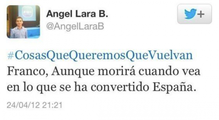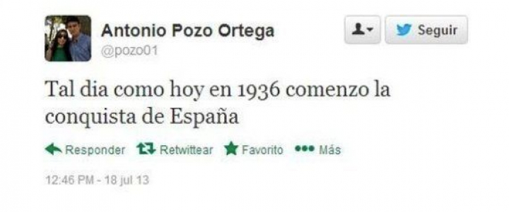 El 18 de julio, día que se cumplió el 77 aniversario del golpe de Estado del dictador Francisco Franco, el militante de Nuevas Generaciones Antonio Pozo Ortega escribió en su cuenta de Twitter: