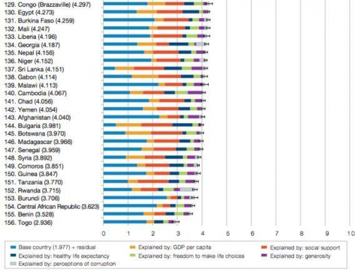 La República Togolesa, uno de los países con la renta per capita más baja,es seguida en la lista de las regiones más tristes por Benin, República Centroafricana, Burundi y Ruanda.