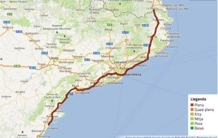 Entre las 13.00 horas y, al menos, las 18.00 horas, la cadena provocará alteraciones en el tráfico de una quincena de carreteras, entre ellas algunas importantes arterias como la AP-7, la A-2, la N-340 o la N-II.