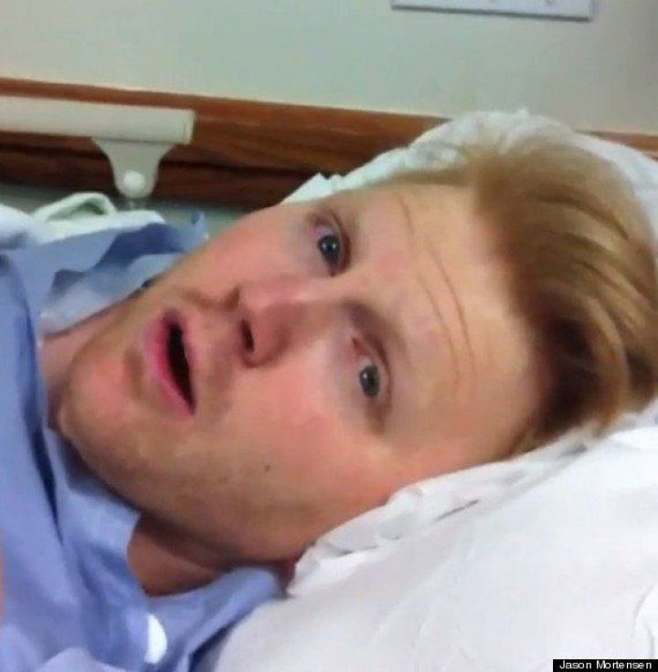 Cuando Mortensen, aún confundido por la anestesia, se da cuenta de que su mujer le está grabando, dice: "¿Te ha mandado el médico? Eres una delicia! Guau. Eres la mujer más bonita que he visto nunca".