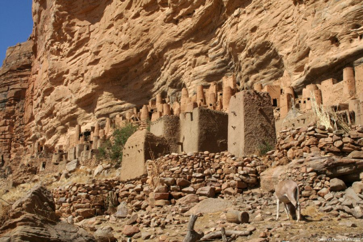 Aquí vivían los Dogones, un grupo étnico muy religioso que habita en Bandiagara. Las cuevas estaban construidas a partir de arcilla, paja y heces, y solo eran accesibles escalando las paredes del acantilado.