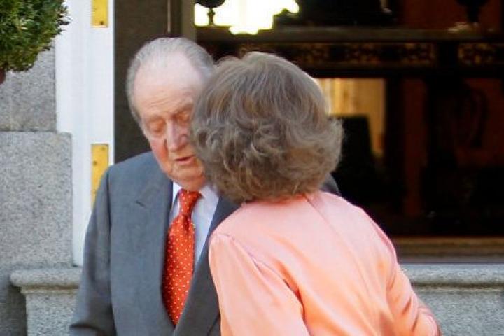 Al incorporarse la infanta Elena a la espera, doña Sofía ha besado a su hija y a su esposo ante un abultado número de fotógrafos y redactores situados frente a ellos.