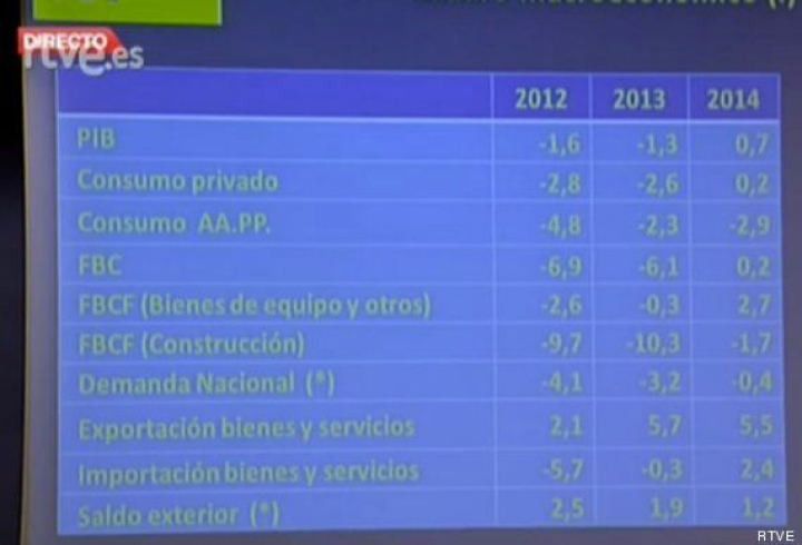 La revisión de las tasa de paro para 2013 y para 2014 viene acompañada de la revisión al alza del Producto Interior Bruto (PIB) para 2014, que el Ejecutivo estima en un crecimiento del 0,7%, dos décimas más de las pronosticadas en el anterior cuadro macroeconómico, tal como adelantó esta semana el presidente del Gobierno, Mariano Rajoy.