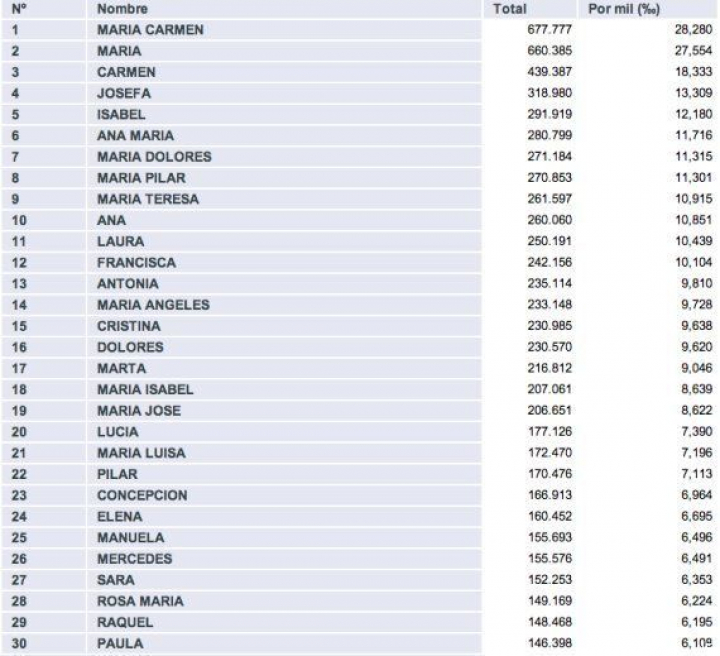 A continuación puedes ver en dos tablas los nombres más usados en España. En este enlace, seleccionando 'Total' y sexo 'Hombres' o 'Mujeres' se puede ver la lista total.