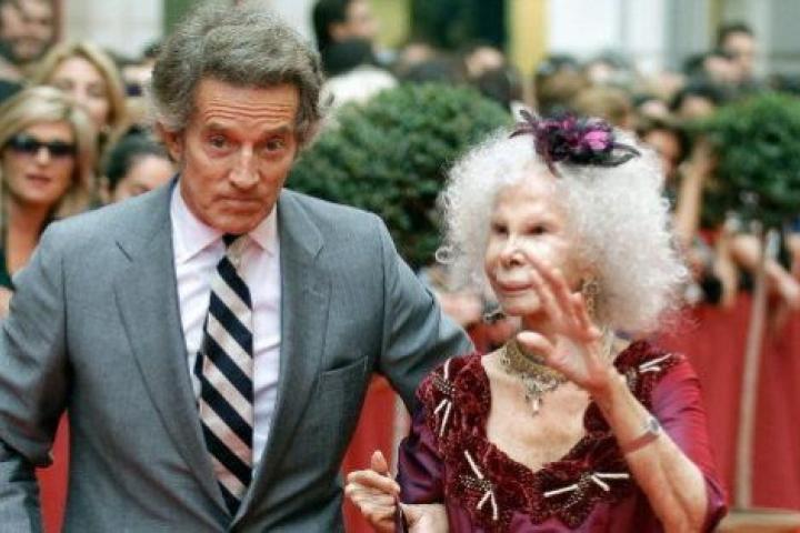 Con su habitual caminar lento y saludando a los vecinos ha llegado uno de los rostros más esperados: el de la Duquesa de Alba, con un moderno vestido color berenjena, manoletinas y una tobillera, acompañada por su esposo Alfonso Díez.
