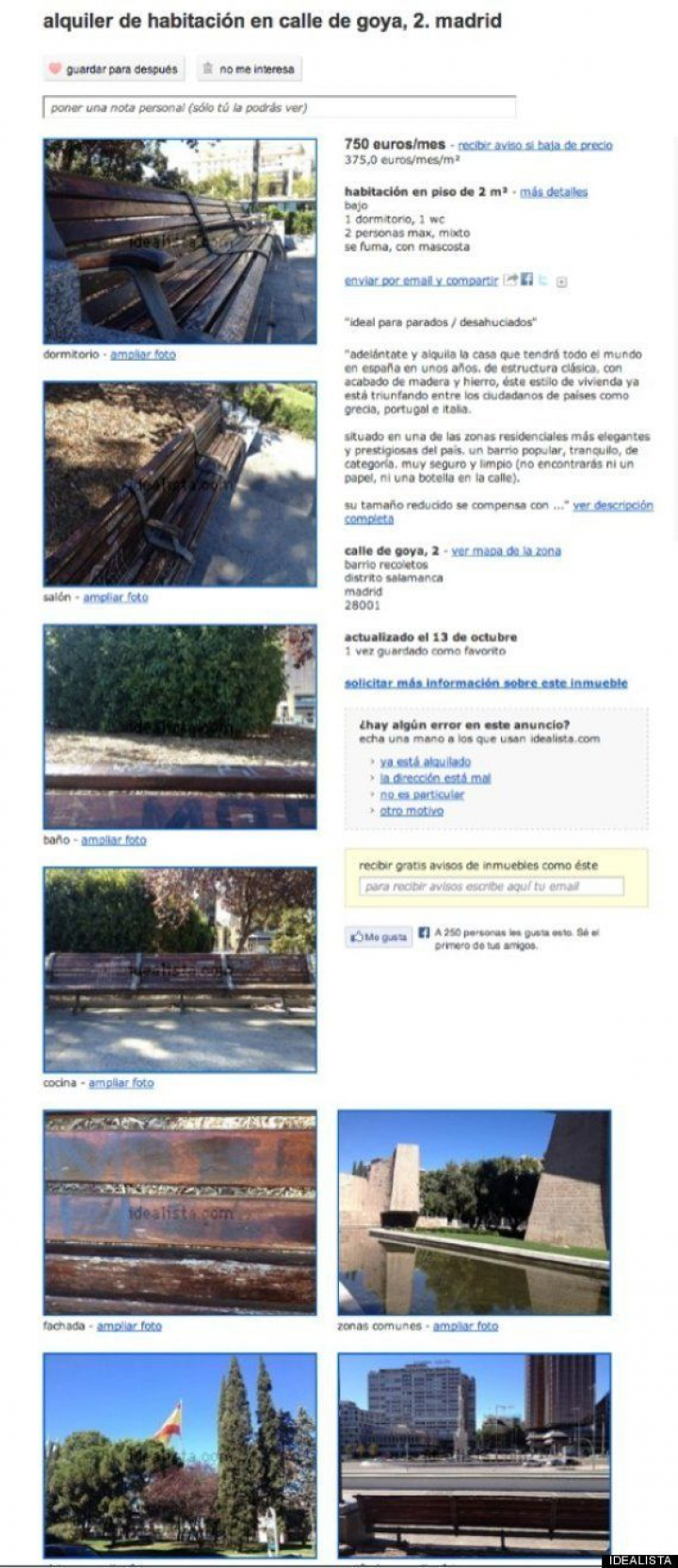 El anuncio se publicó en Idealista este domingo por la noche acompañado de fotos del banco y un texto de lo más irónico: "Adelántate y alquila la casa que tendrá todo el mundo en España en unos años. De estructura clásica, con acabado de madera y hierro, este estilo de vivienda ya está triunfando entre los ciudadanos de países como Grecia, Portugal e Italia".