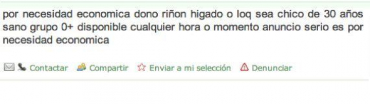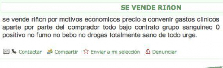 "Se vende riñón por motivos económicos. Precio a convenir. Gastos clínicos por parte del comprador. Todo bajo contrato. No fumo, no bebo, no drogas. Totalmente sano de todo. Urge".
