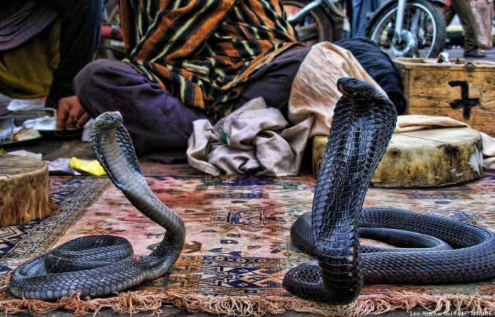 En el mercado más famoso de Marrakech hay de todo: puestos de té, tiendas de ropa, frutas, especias que embriagan el ambiente y serpientes. Pero no hay que asustarse. Las serpientes –se supone- están hipnotizadas por los encantadores y únicamente bailarán al son de la música.