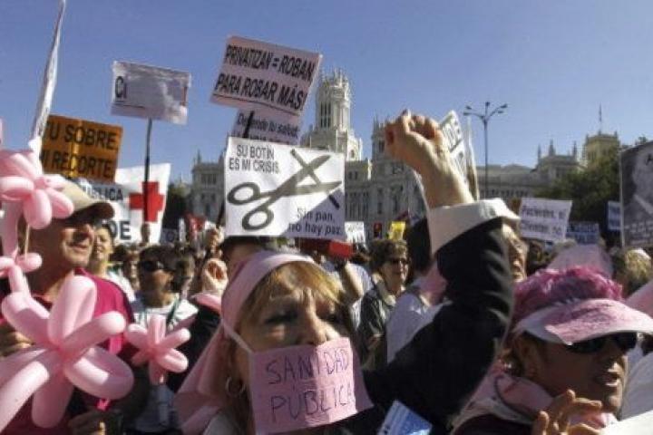 a manifestación contra la privatización de la sanidad madrileña convocada por asociaciones y sindicatos arrancó este domingo en la plaza de Cibeles, una vez que se han encontrado en ese punto los varios miles de manifestantes que han partido una hora antes de Atocha, Colón y la Puerta de Alcalá.