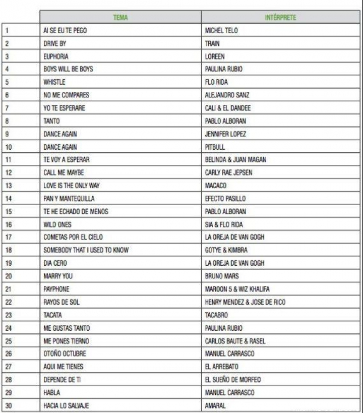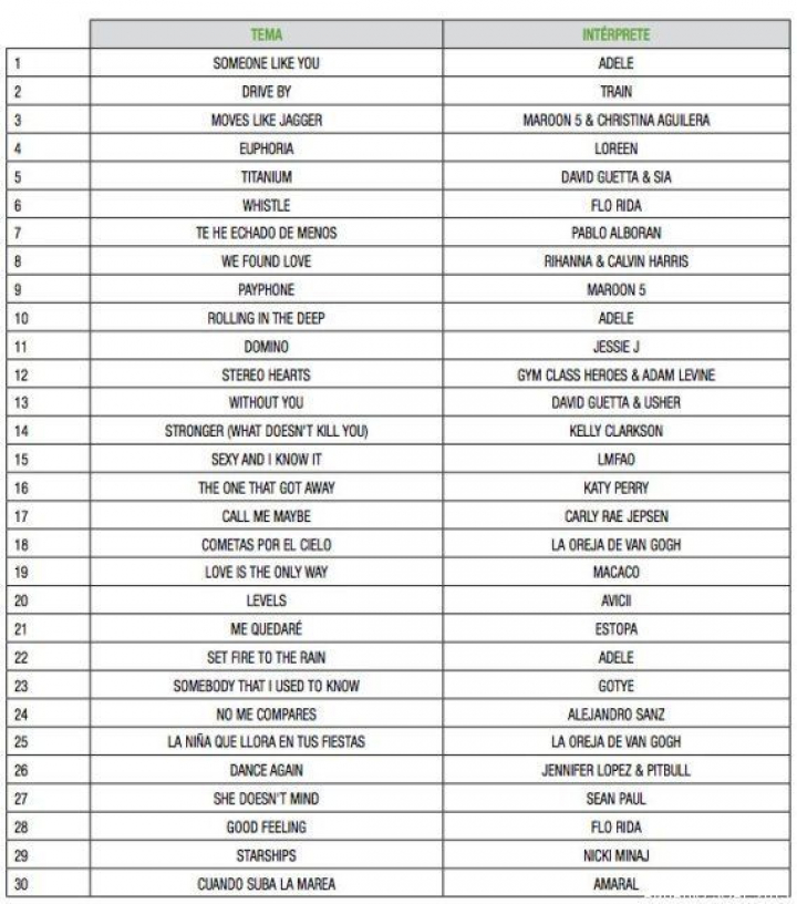 La lista de canciones que más sonaron en radio en 2012
