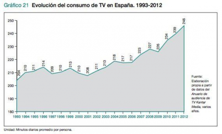 Desde que comenzó la crisis, las cifras hablan de menor consumo de teatro y cine, caída de las ventas de música... Lo llaman el gran trastazo de la industria cultural y del ocio. Con la televisión, que también forma parte del sector del entretenimiento, pasa lo contrario: su consumo no deja de aumentar desde que empezó la crisis y, según el Anuario de la SGAE, en base a datos de un informe de la consultora Kantar, los ciudadanos en España vieron el año pasado una media de 246 minutos al día (19 minutos más que en 2008). Es decir: 4,1 horas al día, casi 1.500 horas al año o el equivalente a 62,35 días. ¡¡¡Dos meses!!!