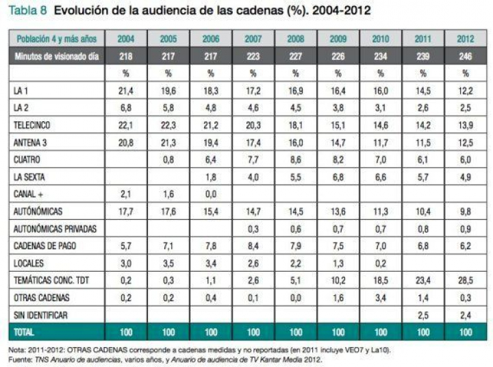 Es la explicación que recoge el informe de la SGAE. También es curiosa con la fragmentación de la audiencia, que ha llevado a uniones como la de Mediaset (acuerdo entre Telecinco y Cuatro firmado en 2010) y Grupo Antena