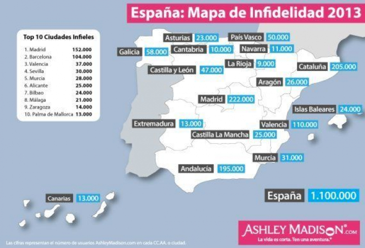 El perfil medio de los usuarios es de 42 años en el caso de los hombres y de 35 en el de las mujeres. Los hombres que usan esta red en busca de aventuras son casados (88%), altos directivos (11%) y empresarios (13%). Respecto a las mujeres, el 67% están casadas, el 19% son amas de casa y el 14% ocupan cargos de administración de empresas. Ellas tienen una media de 1,4 amantes por año y ellos de 2,4, según la compañía, que cuenta con 1,1 millones de usuarios en España.