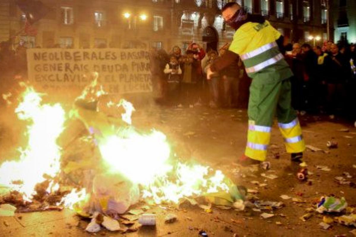 Cientos de manifestantes protestan contra los recortes en limpieza con hogueras en la Puerta de Sol