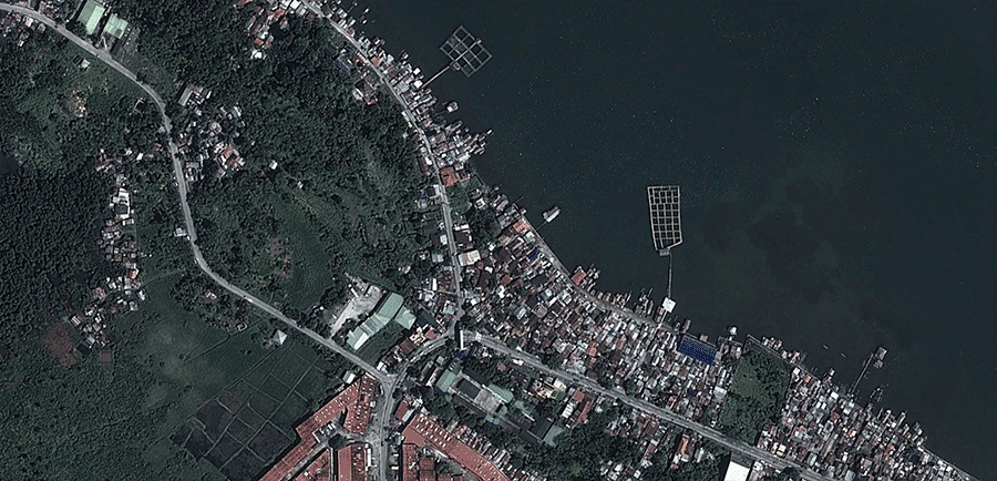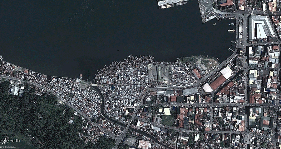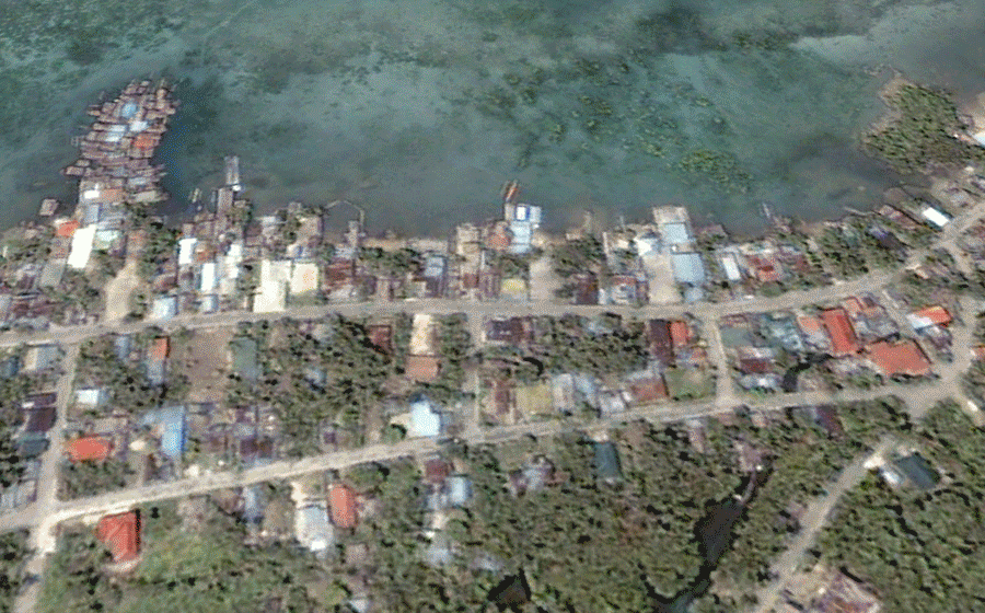 Los GIFs que muestran vistas aéreas de las zonas golpeadas por el tifón antes de que éste tocase tierra. A medida que las imágenes evolucionan puede comprobarse cómo las chozas se aplanan en pilas de palos, los edificios acaban convertidos en escombros y las estructuras que rodean las cosas desaparecen.