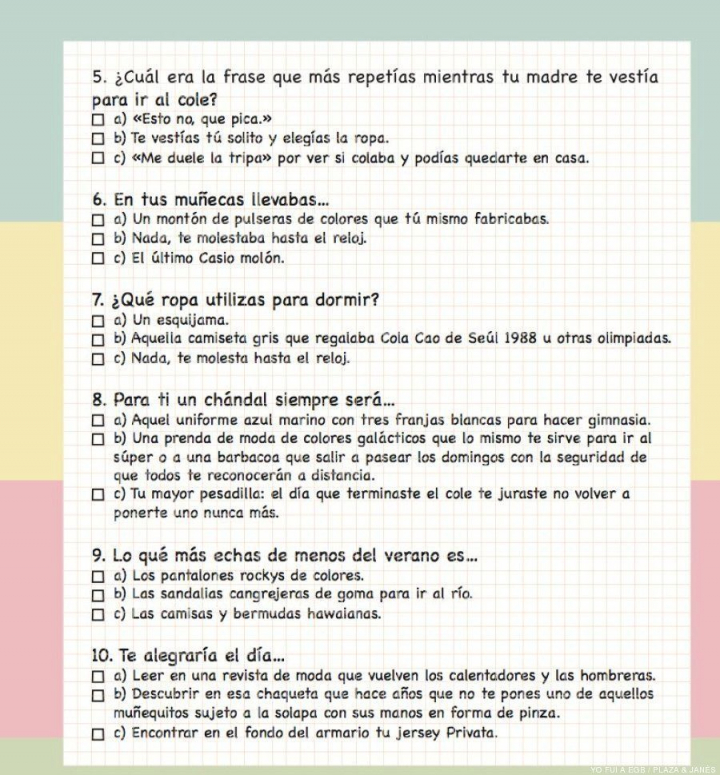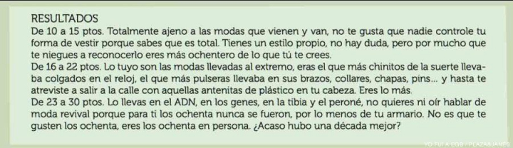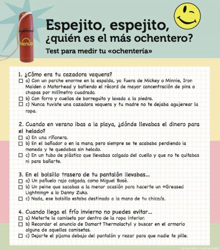 Recopilan los recuerdos de infancias de aquellos que hoy en día tienen de veintitantos a cuarenta y tantos con fotos de productos de la época y textos que recuperan la moda y las costumbres en los colegios y hogares en los tiempos de la EGB. Además, incluyen ejercicios de nostalgia y test como este, titulado ¿Quién es más ochentero?, que reproducimos a continuación, cortesía de la editorial Plaza & Janés.