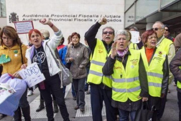 A la entrada de los juzgados había al menos medio centenar de personas, entre ellos los 'iaioflautas' y miembros del 15-M, que proferían gritos como "ladrones", "corruptos" y pedían justicia.