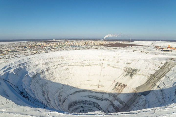 Concretamente, la mina de diamantes Mir, situada a las afueras de la ciudad de Mirni, ofrece un estremecedor paisaje sobre las consecuencias de la acción humana en la naturaleza. La actividad minera comenzó en 1955 y en la actualidad tiene un diámetro exterior de 1.200 metros y una profundidad de 450 metros.