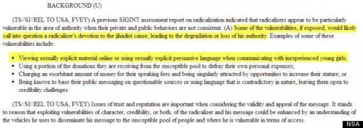 De acuerdo con dicho documento, la NSA cree que el uso de la vigilancia electrónica para desvelar actividades sexuales en la web puede dificultar a estos “radicalizadores” mantener su credibilidad. “Sólo con las páginas de acceso, se revelan puntos débiles que podrían aprovecharse de forma más efectiva si se emplearan en combinación con las vulnerabilidades del carácter y/o de la credibilidad del mensaje para elaborar una percepción del mensajero así como de sus seguidores”.