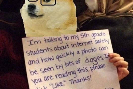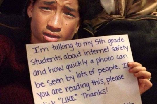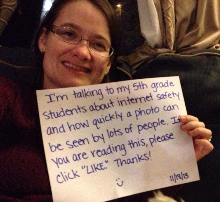 "Quiero ilustrar a mis estudiantes de instituto (curso 7-9) cómo de rápido una fofo puede ser compartida en internet. Por favor, dale a "me gusta" o "compartir" esta imagen para ayudarme a enseñar precaución y discernimiento a los estudiantes de mis clases".