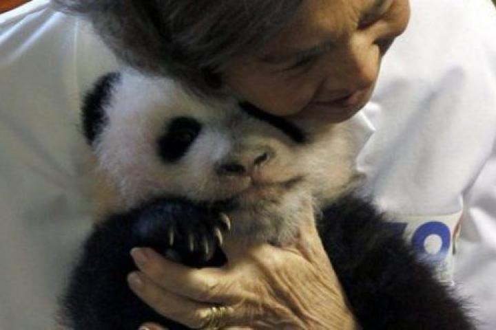 El bebé panda que tiene en brazos la Reina Sofía nació el 30 de agosto. Pesaba entonces 210 gramos -ahora supera los 5 kilos- y medía 15 centímetros.