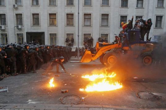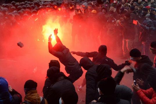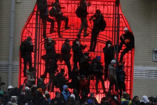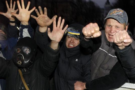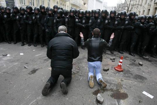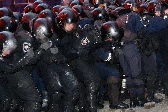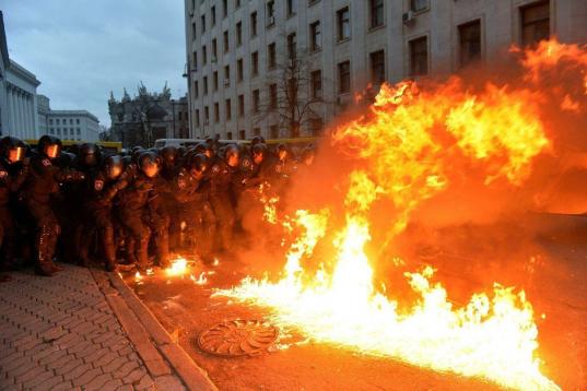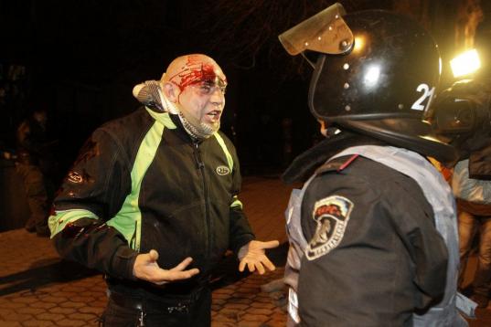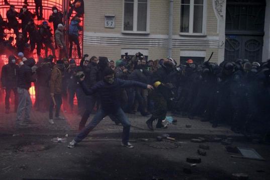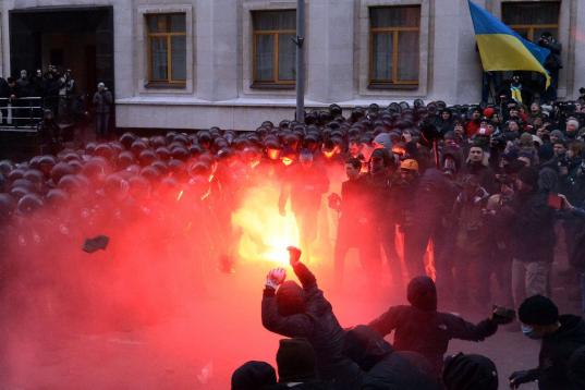 Decenas de miles de ucranianos han salido a las calles de Kiev para forzar al presidente Viktor Yanoukovich a que firme de una vez el acuerdo de asociación con la Unión Europea. La protesta es cada vez más violenta y testigos de Reuters aseguran que la multitud intenta romper el dispositivo policial que rodea el palacio presidencial con la ayuda de un tractor.