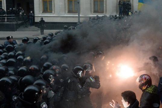 Además, diversos medios locales informan de que un grupo de opositores se enfrentó con la policía que custodia la sede presidencial, mientras otro grupo entró en el Ayuntamiento. La agencia rusa ITAR-TASS señaló que "han comenzado enfrentamientos entre manifestantes y policías" que custodian el edificio, y añade que desde una calle cercana "se escuchan disparos y se ve humo". Cerca de cien policías han resultado heridos.