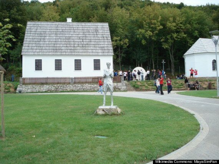La casa donde nació Nikola Tesla (a la izquierda) y la iglesia donde su padre oficiaba misa en Smiljan. Los dos edificios se incendiaron durante las Guerras de Yugoslavia y el Gobierno croata posteriormente las reconstruyó.