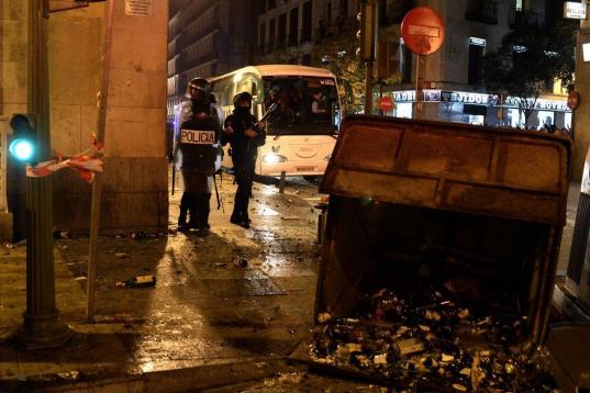 El vehículo terminó con la luna trasera rota y en ese momento la Policía Nacional, que seguía los pasos de esa protesta, cargó en la calle Atocha contra los manifestantes, que a su vez respondieron con lanzamientos de botellas, procedentes la mayoría de ellas de un contenedor de vidrio cercano. En otras calles se ha visto fuego y barricadas formadas por contenedores.