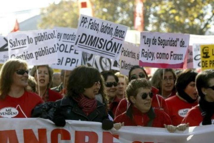 Los manifestantes corean consignas en contra de la privatización de los servicios públicos y lemas como "Rajoy y Cospedal, a Soto del Real", "Corriendo, corriendo, que llega Lasquetty" o "Sin educación no hay ciencia, sin ciencia no hay Sanidad."