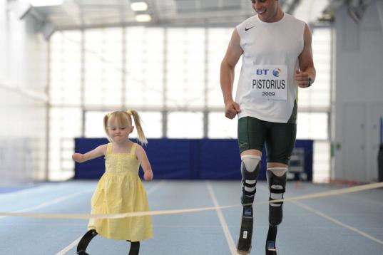 Pistorius quiso conocer a Ellis Challis, de cinco años, que también usa prótesis, y de su encuentro quedaron imágenes como esta. La pequeña, que perdió sus manos y sus pies por una meningitis cuando tenía 15 años, cruzó la línea primer...