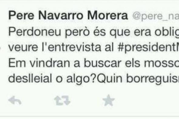 Este es el tuit que ha desatado la polémica. Su responsable, un miembro del equipo del líder del PSC, Pere Navarro, ha renunciado este martes a su cargo después de que este lunes "cometiera un error" al publicar sin permiso en el perfil del líder este mensaje sobre la entrevista de TV3 al presidente de la Generalitat, Artur Mas.