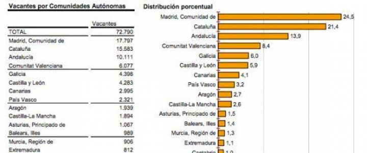 Madrid y Cataluña concentran el mayor número de vacantes cubriendo prácticamente la mitad de puestos disponibles (17.797 y 15.583, respectivamente) y Navarra y La Rioja, el menor, con 541 y 333.